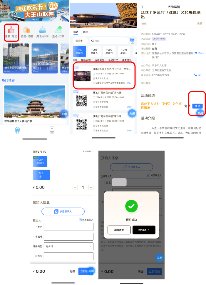 选择“免费・专区”,进入后可查询并预约各类免费的活动以及场馆。